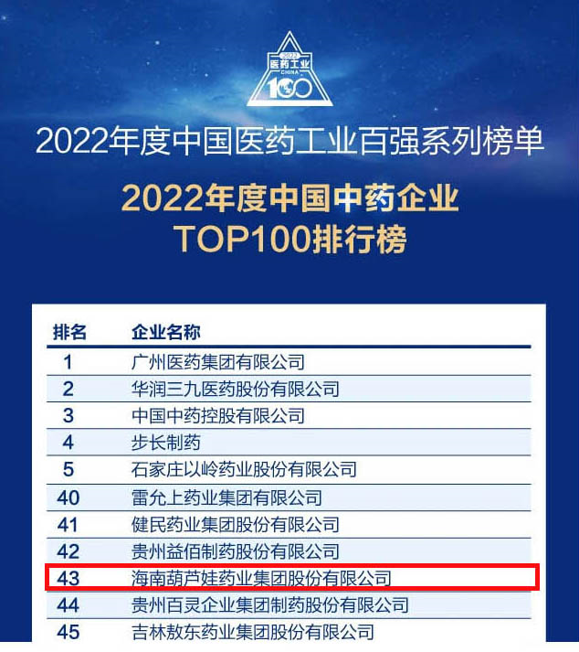 人生就是博药业集团连续4年荣登“中国中药企业TOP100排行榜”,排名上升至第43位